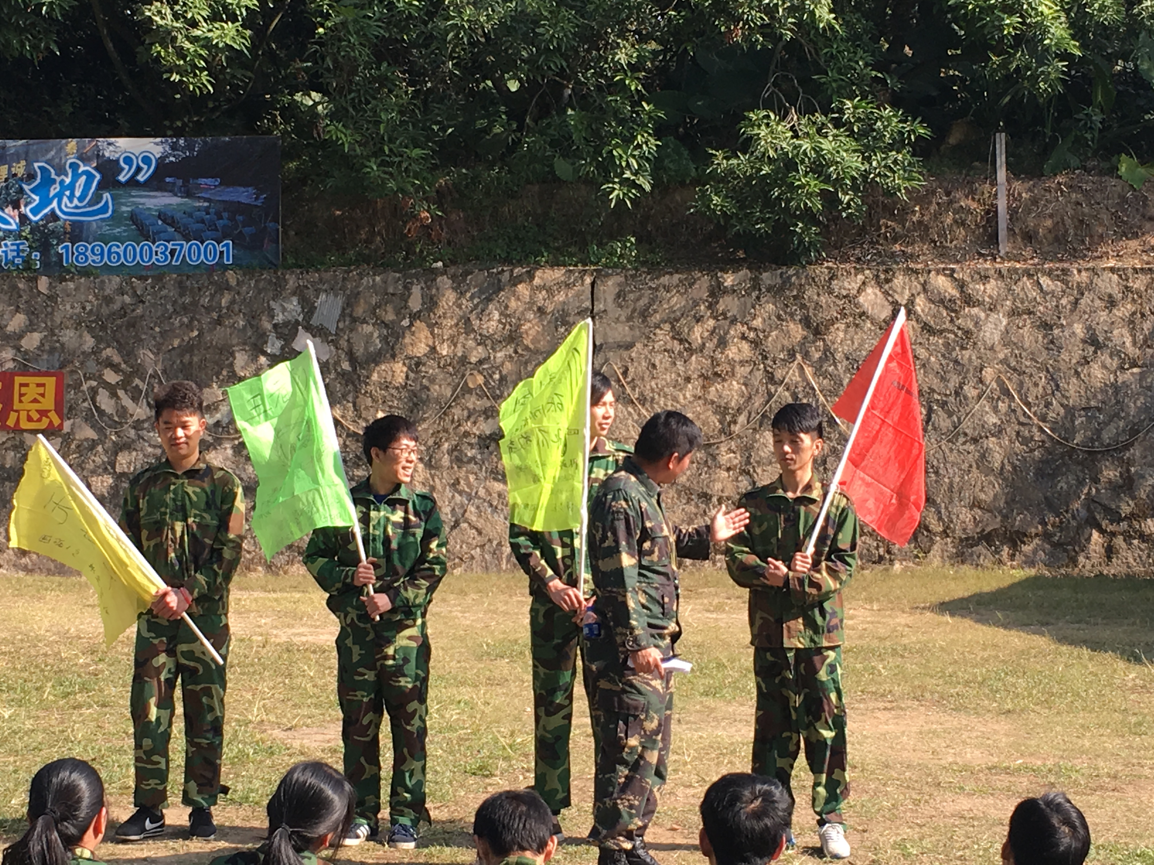 到达拓展基地后,大家被分成黄、红、绿、浅绿四队,各队选出了本队队长,并给本队命名,设计Logo、队歌、口号与队形展示,所有这些程序,全部在规定时间30分钟之内完成。这是集体智慧与团队精神的考验,尽管时间短暂,但每个队都给出了优异的答案。