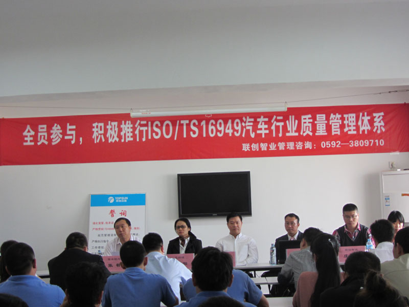 2012年11月01日 福建华阳超纤有限公司邀请联创职业邱老师、庄老师、李老师参与会议,还有公司的班长级、干部级和干部级以上领导参与积极推行ISO/TS16949汽车行业质量管理体系的启动大会。会议严格贯彻TS16949标准条款要求,全员要参与做到:规范管理流程,明确作业要求,严格执行指令,贯彻专业技能,提升工作绩效,用我们的行动实现团队目标,创造华阳超纤辉煌的明天。会议期间参与会议的所有成员起立宣誓华阳的誓词,证明华阳的各级领导干部和所有成员都有信心做到,争取早日取得认证资格证书。